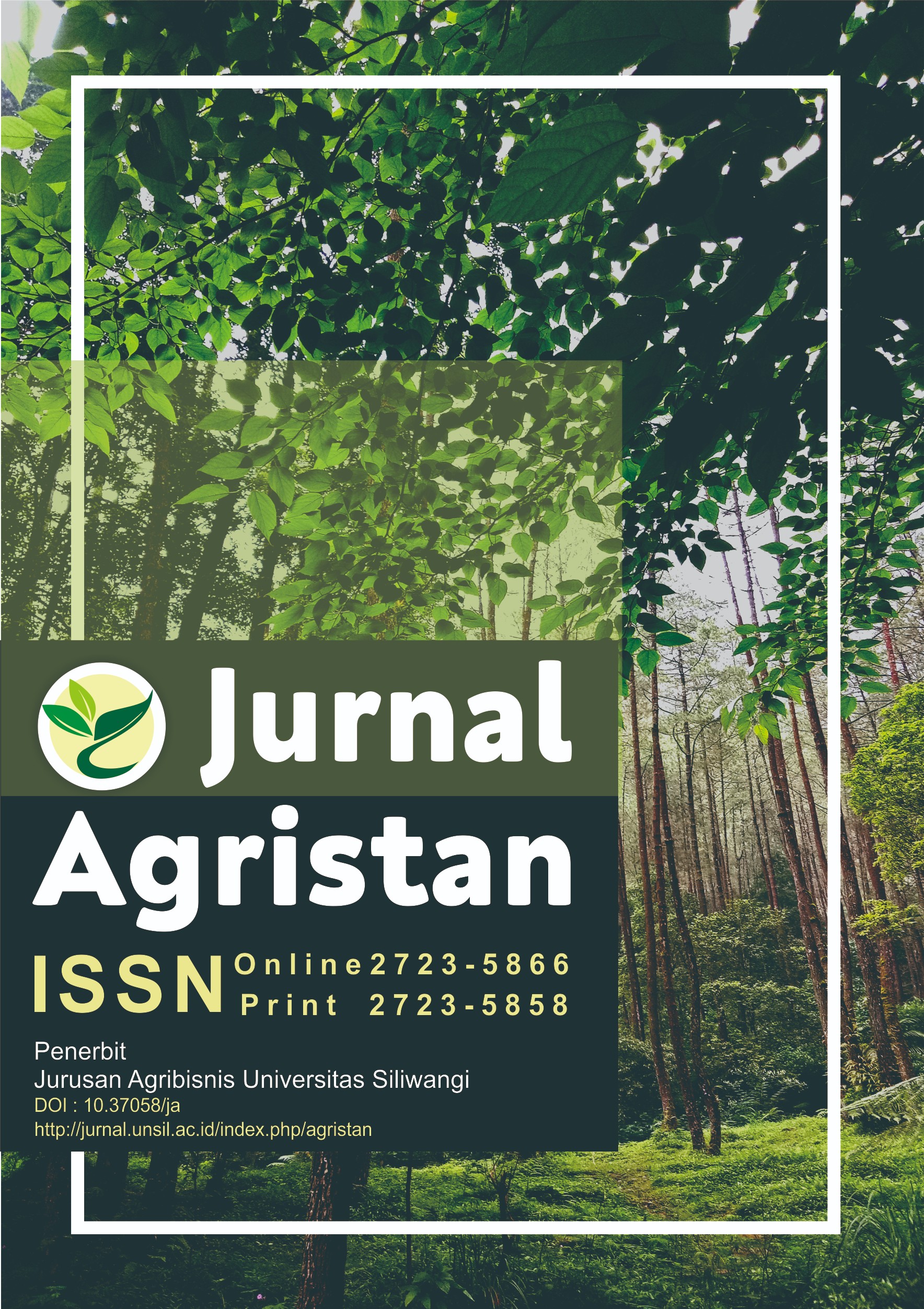 Jurnal Agristan is a scientific journal that is published regularly, twice a year, in May and November as a medium for disseminating information on research results for lecturers, researchers, and practitioner. Jurnal Agristan is published by the Agribusiness Department, Faculty of Agriculture, Universtas Siliwangi and associated with Indonesian Society of Agricultural Economics (PERHEPI) based on the Cooperation Agreement Number 0312/SPK/PP.PERHEPI/III/2022.