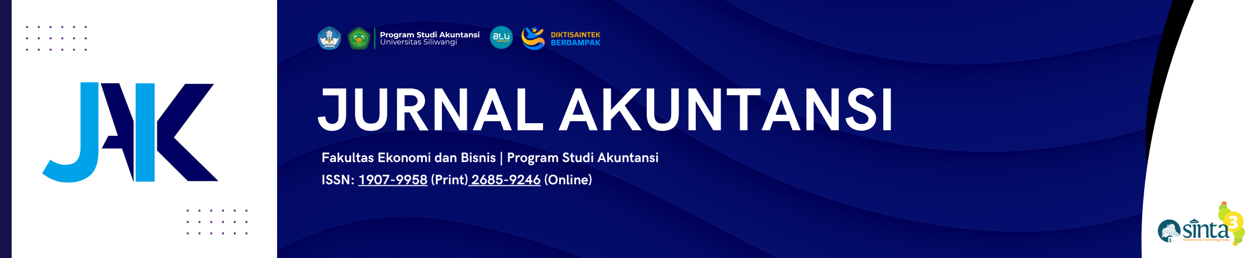 JAK: Jurnal Akuntansi is a peer-reviewed journal published by the Department of Accounting, Faculty of Economics, Universitas Siliwangi. ISSN: 1907-9958 (Print) and 2685-9246 (Online). JAK is accredited grade 3 by Ministry of Research, Technology and Higher Education of the Republic of Indonesia Decree (SK) No.177/E/KPT/2024.