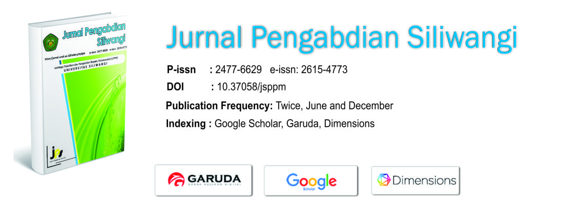 Journal Pengabdian Siliwangi is a peer-reviewed community service journal published twice a year (June and December) by the Institute for Research and Community Service (LPPM) Universitas Siliwangi, Indonesia. The journal publishes high-quality articles resulting from community engagement, empowerment, and service programs that integrate academic knowledge and local wisdom to enhance community welfare and sustainable development. Jurnal Pengabdian Siliwangi has been indexed in: Google Scholar, Garuda, Crossref, Dimensions, and all manuscripts have been equipped with Digital Object Identifiers (DOIs).