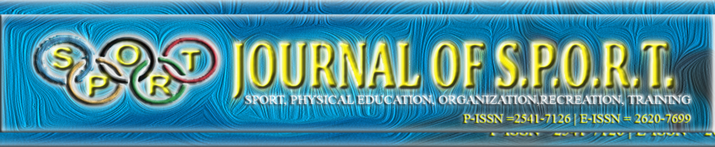 Journal of S.P.O.R.T adalah Jurnal Pendidikan Jasmani Universitas Siliwangi yang menerbitkan artikel mengenai olahraga pendidikan, olahraga prestasi, dan olahraga masyarakat dengan ISSN 2541-7126 (print) dan ISSN 2620-7699 (online) yang terbit 3 kali dalam satu tahun pada bulan Maret, Juli dan November.